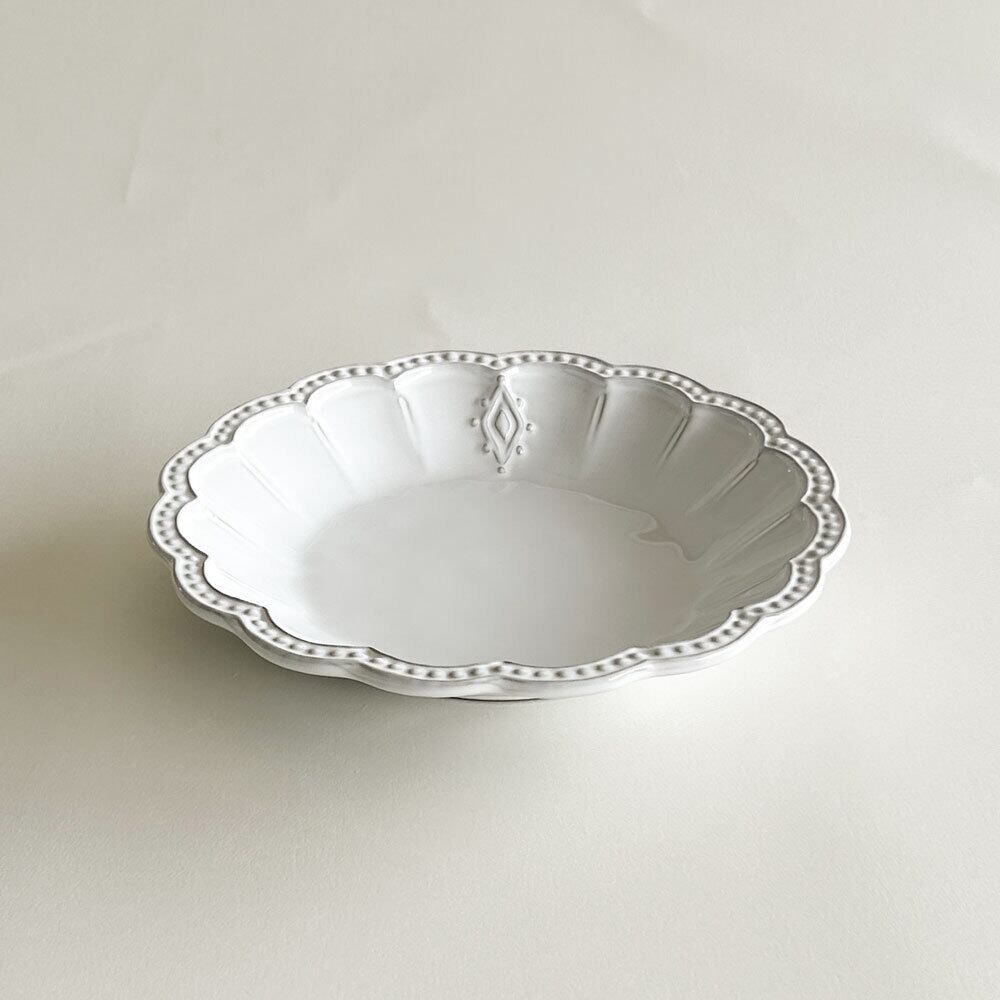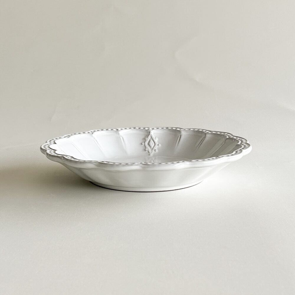リムにうっすらと浮き上がる模様が魅力です。清楚で気品のある模様がテーブルコーデのポイントになります。
