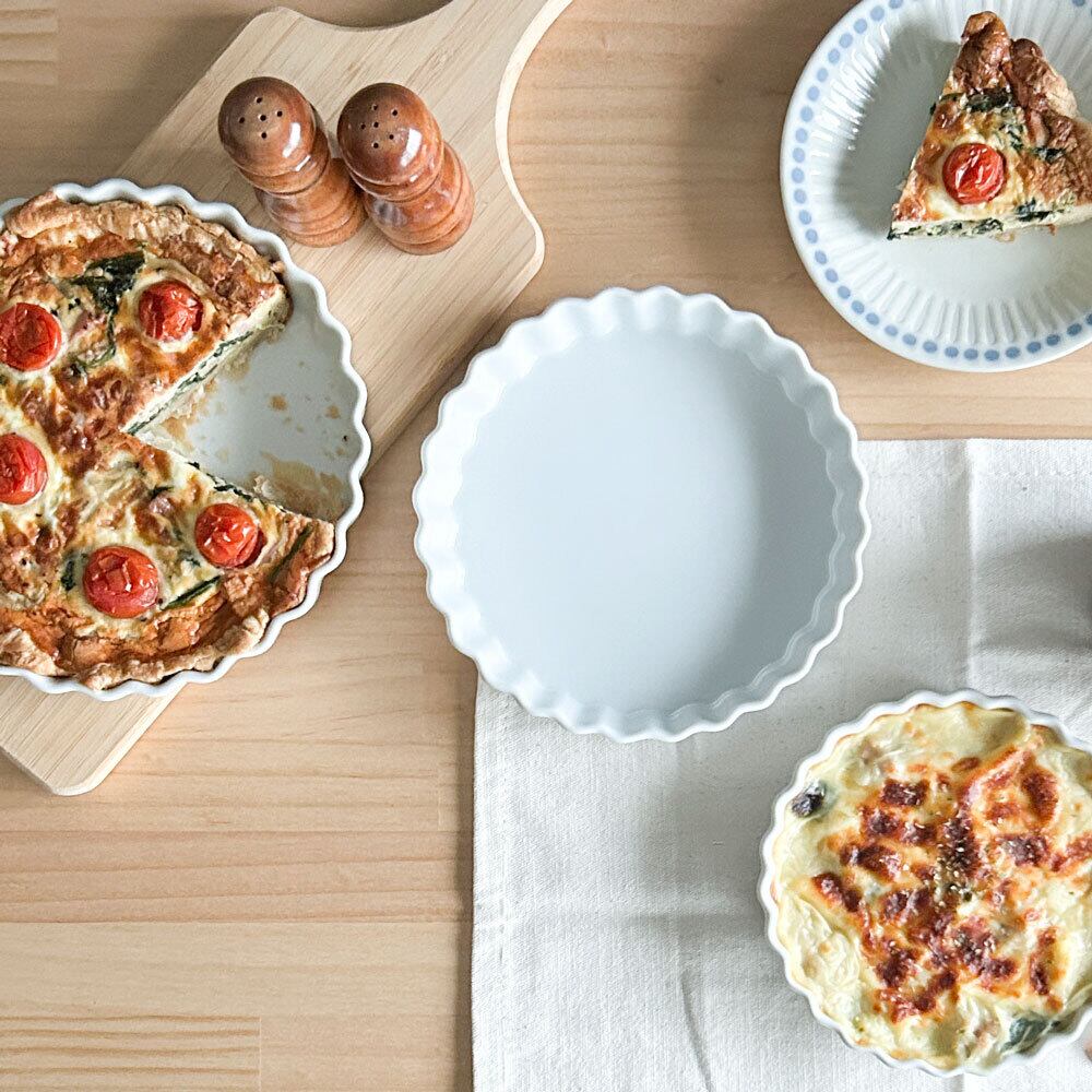 磁器製のパイ皿は焼き上がりの熱々の状態をそのままテーブルに出すことができ、冷めにくいのでおもてなしにもぴったりです。