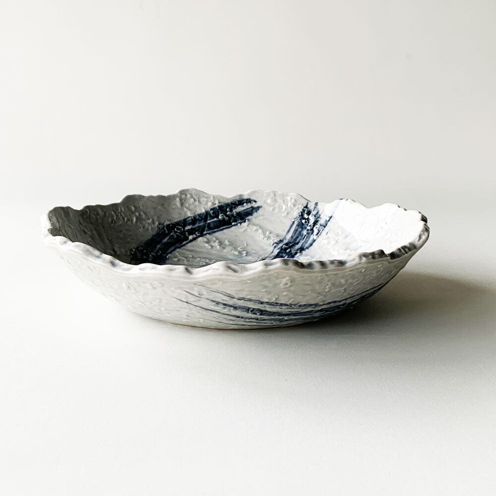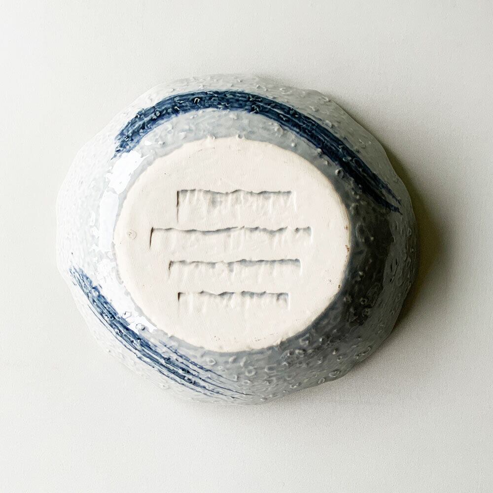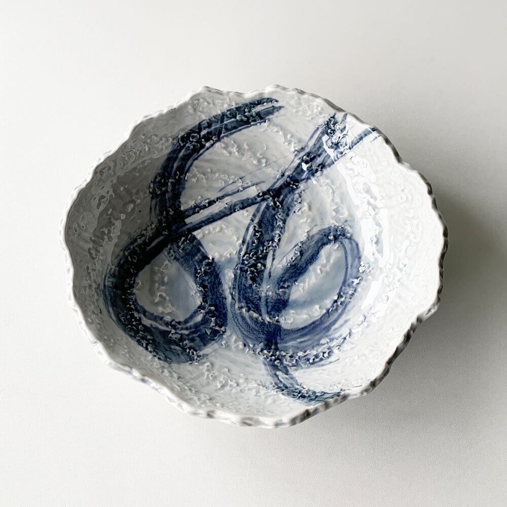 薄い青磁の生地色に呉須色の筆書きの模様が施されており、涼しげな印象を与えます。