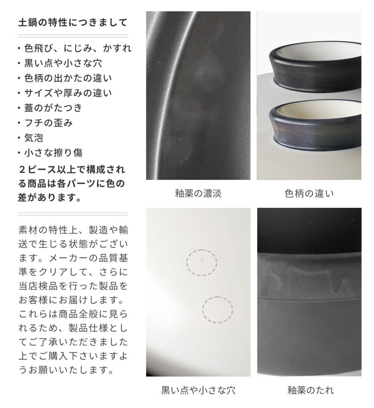 製品の特性上、釉薬の濃淡、釉薬の厚みによる凹凸、小さな黒い点・穴・突起、若干のサイズ誤差などがございます。