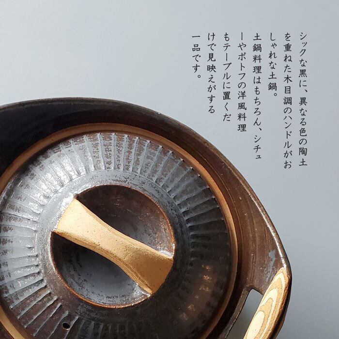 シックな黒に、異なる色の陶土を重ねた木目調のハンドルがおしゃれな土鍋。