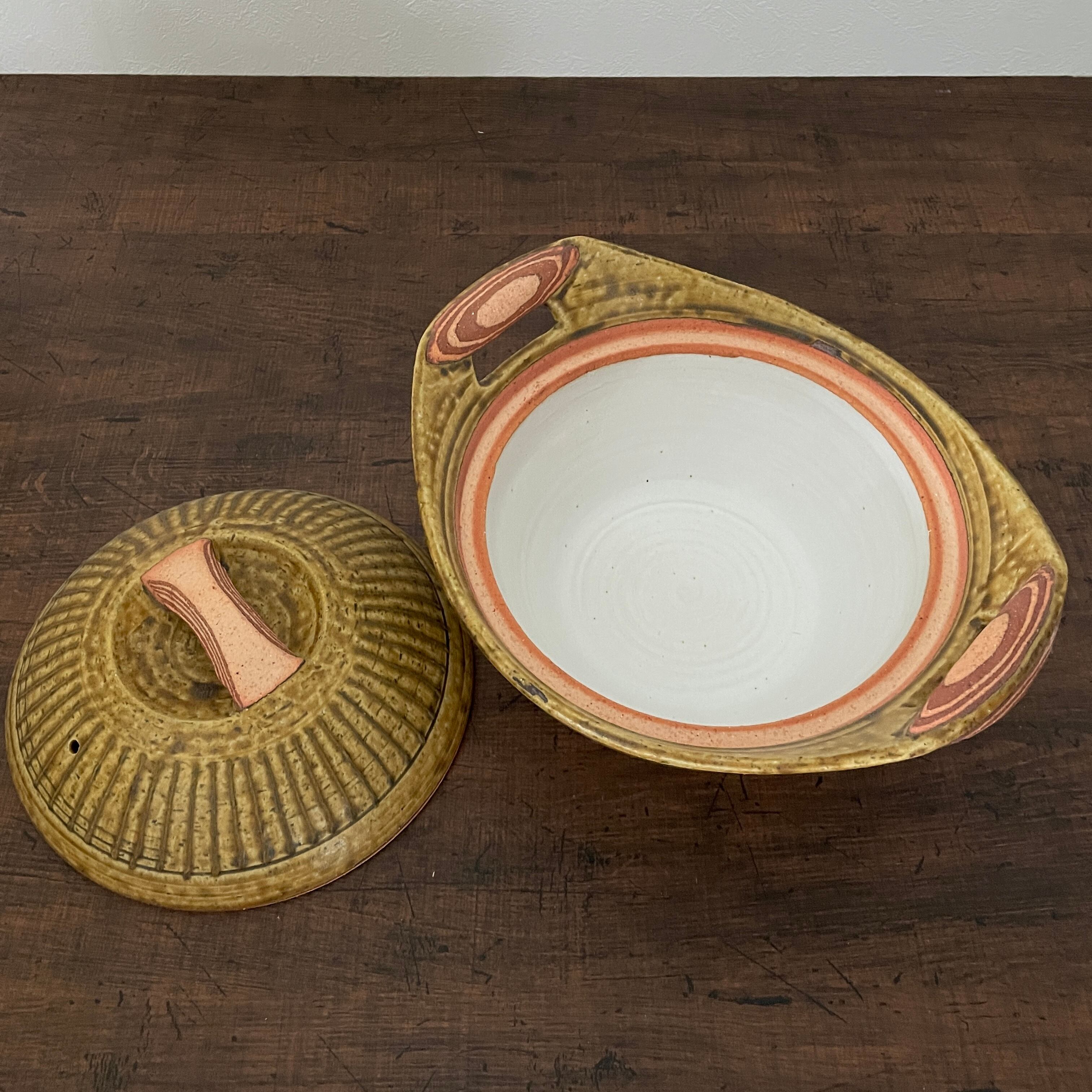 異なる色の粘土からなる木目調のハンドルがおしゃれな土鍋。