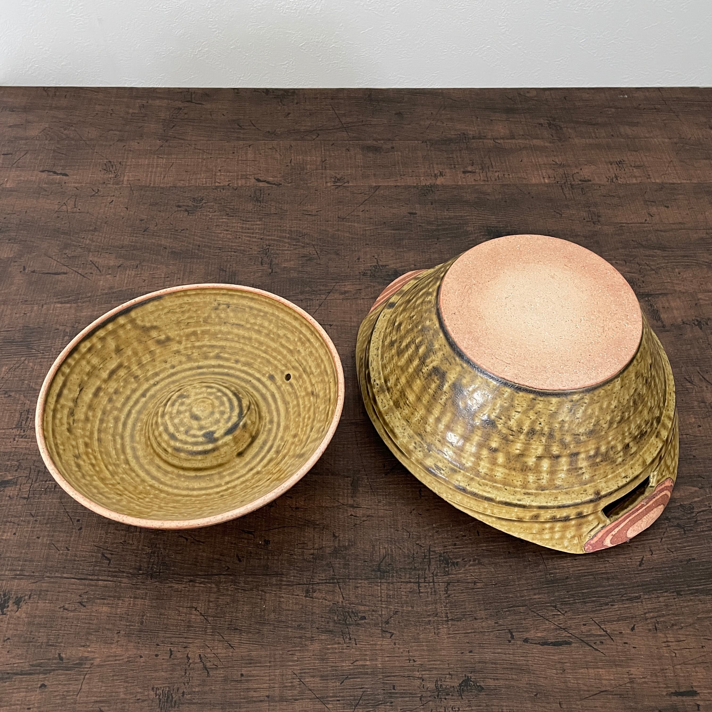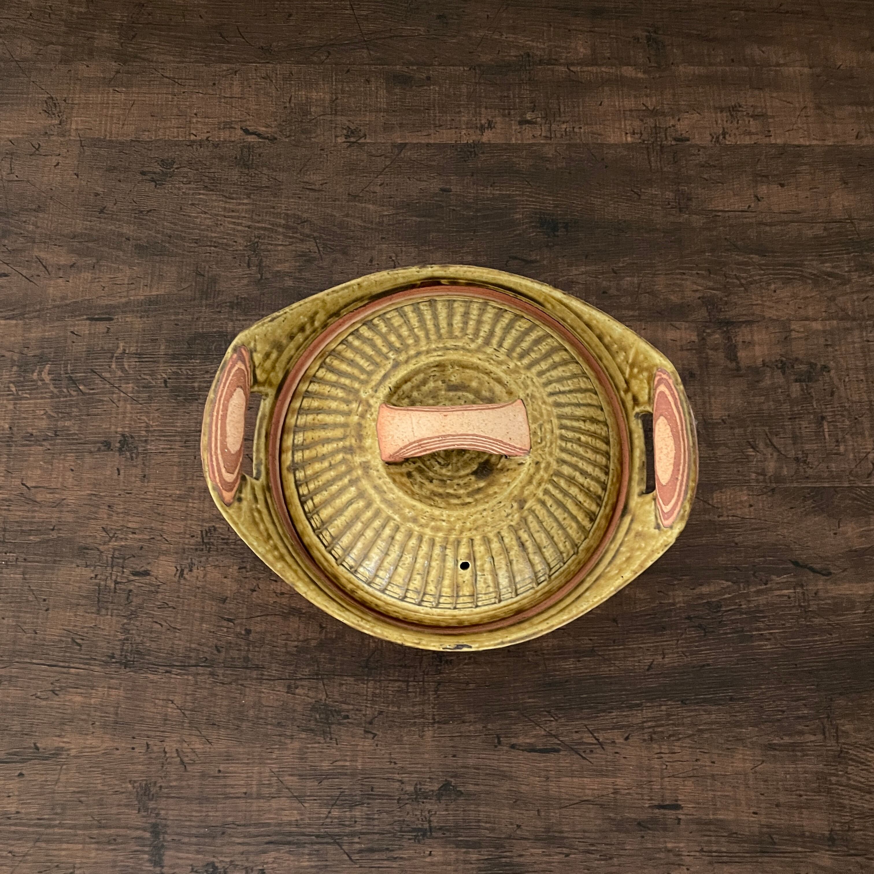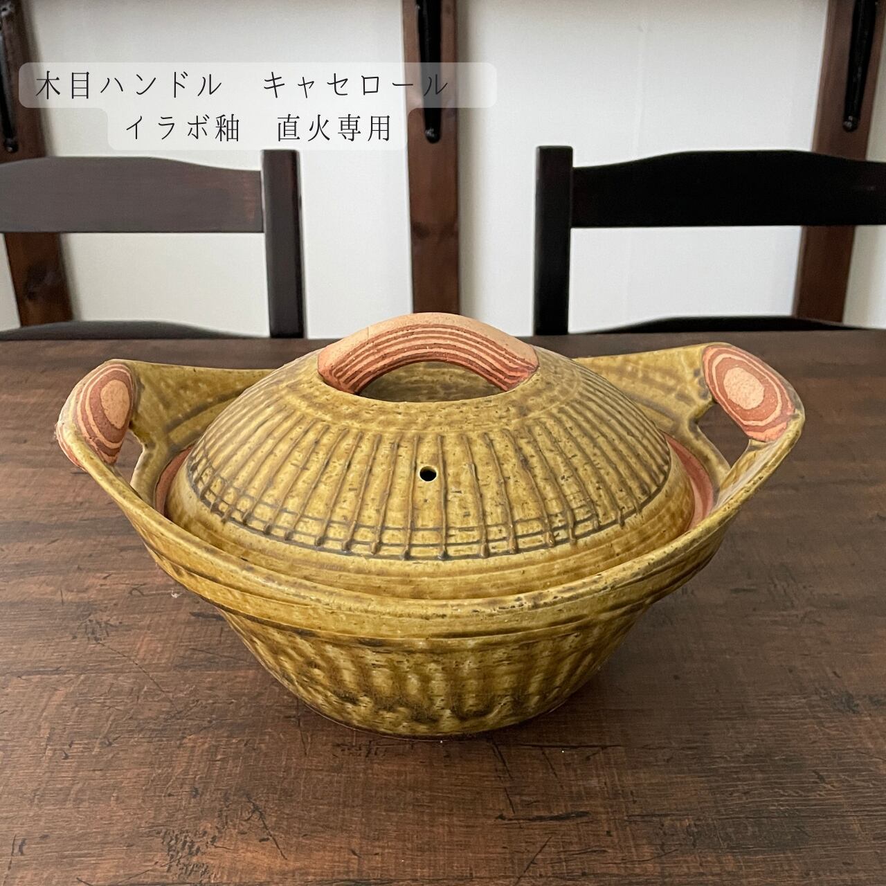 黄色いイラボ釉が特徴のキャセロール土鍋です。