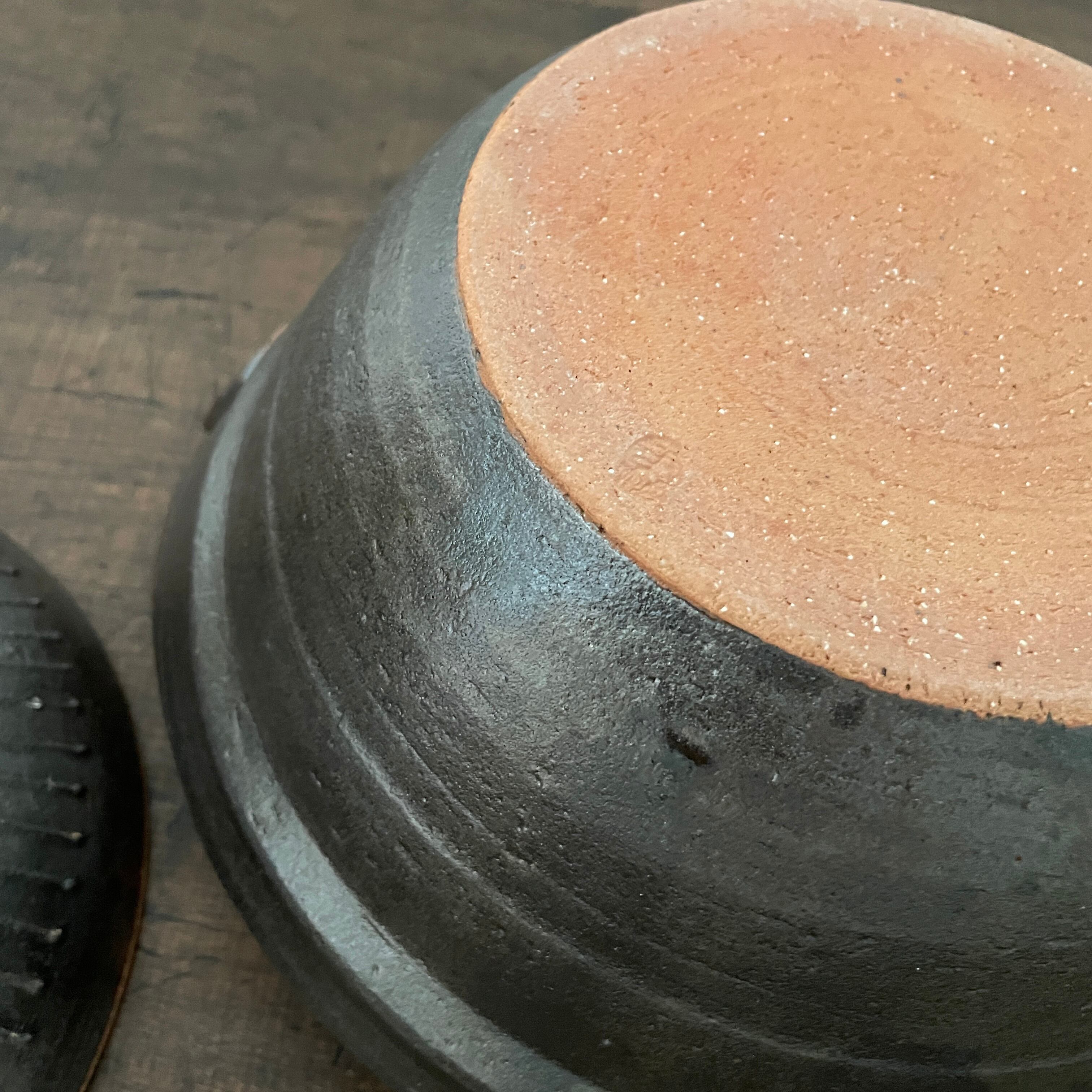 黒い釉薬で仕上げていますが、釉薬の薄いところは下地の赤茶が透けて、こげ茶色に見えます。