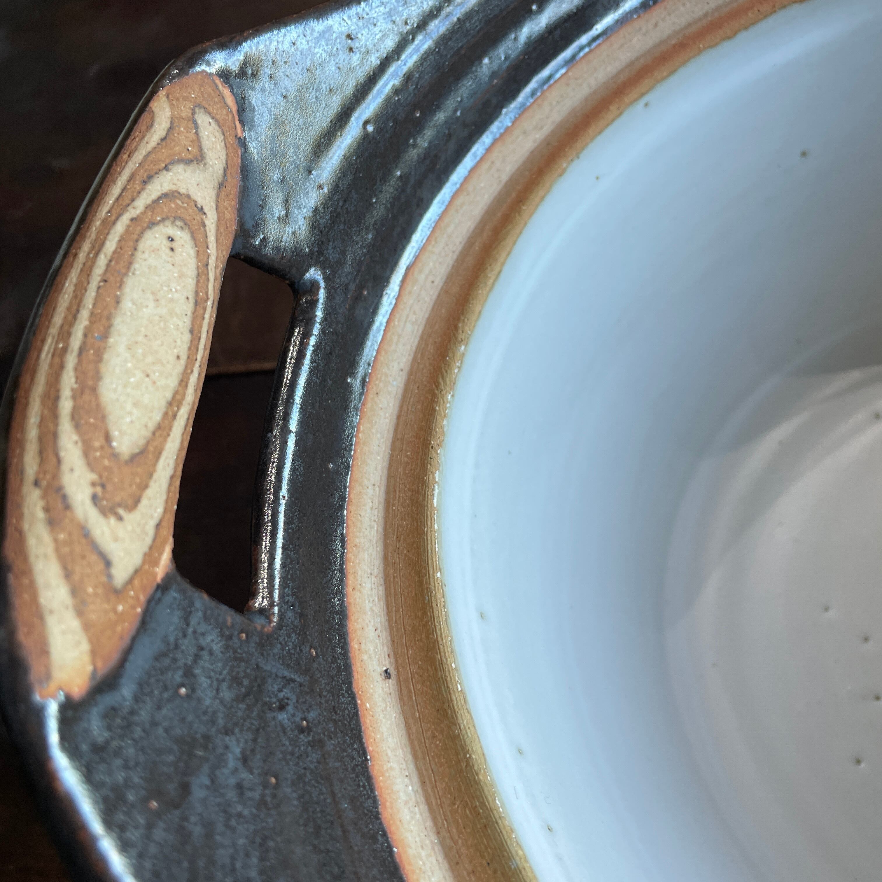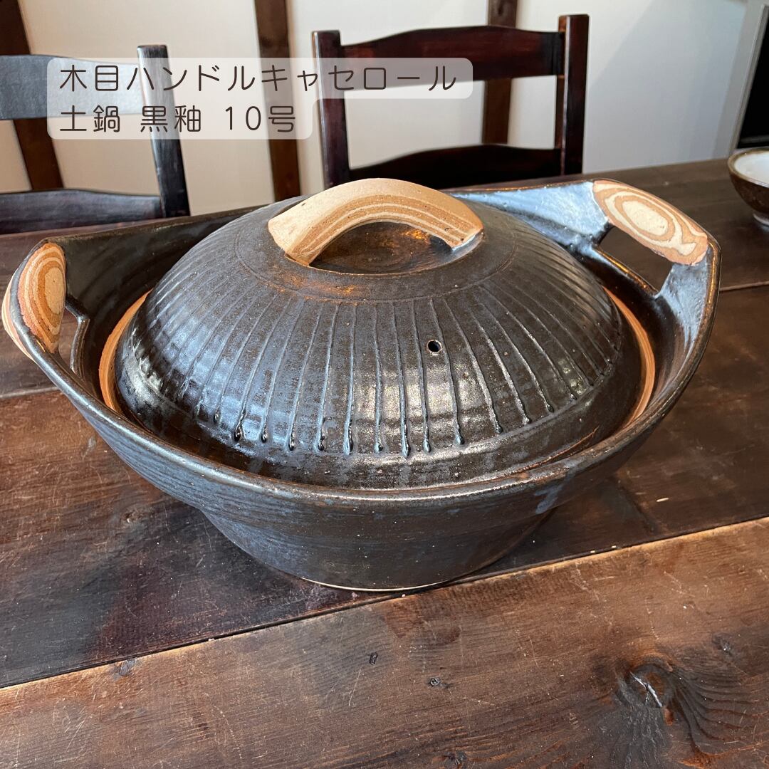 シックな黒に、異なる色の陶土を重ねた木目調のハンドルがおしゃれな土鍋。