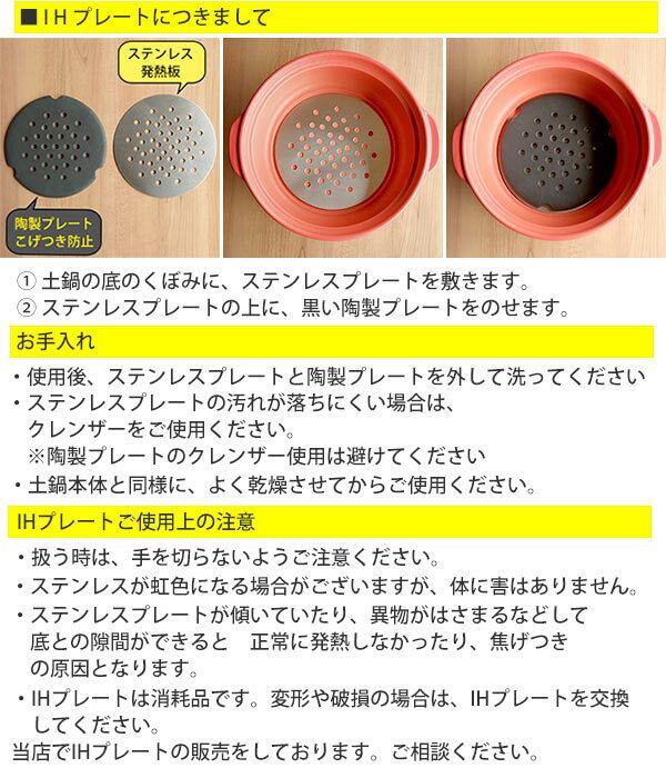 1.耐熱宴土鍋土鍋の底のくぼみにステンレス製のIHプレートを敷きます。